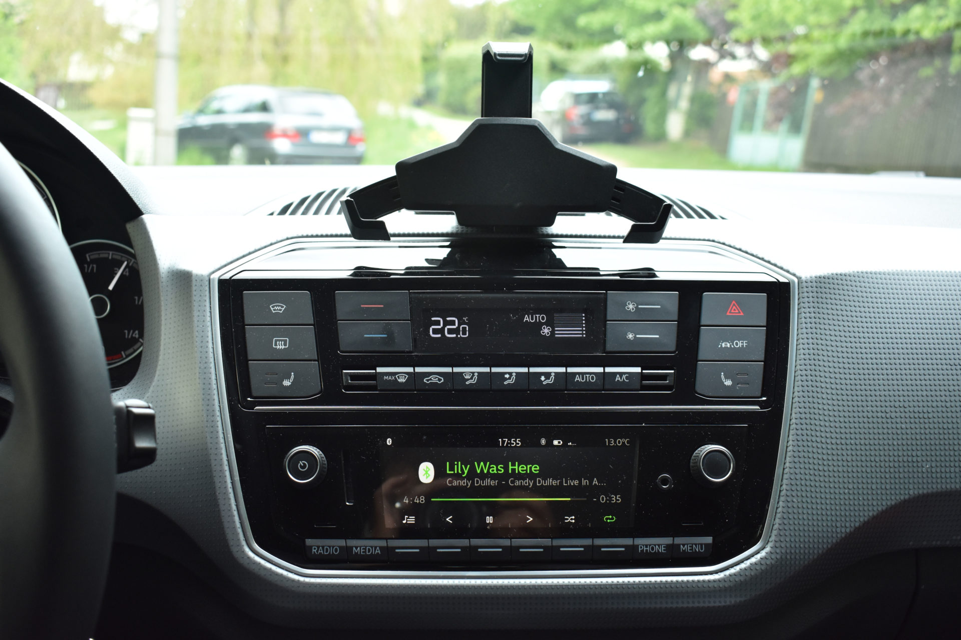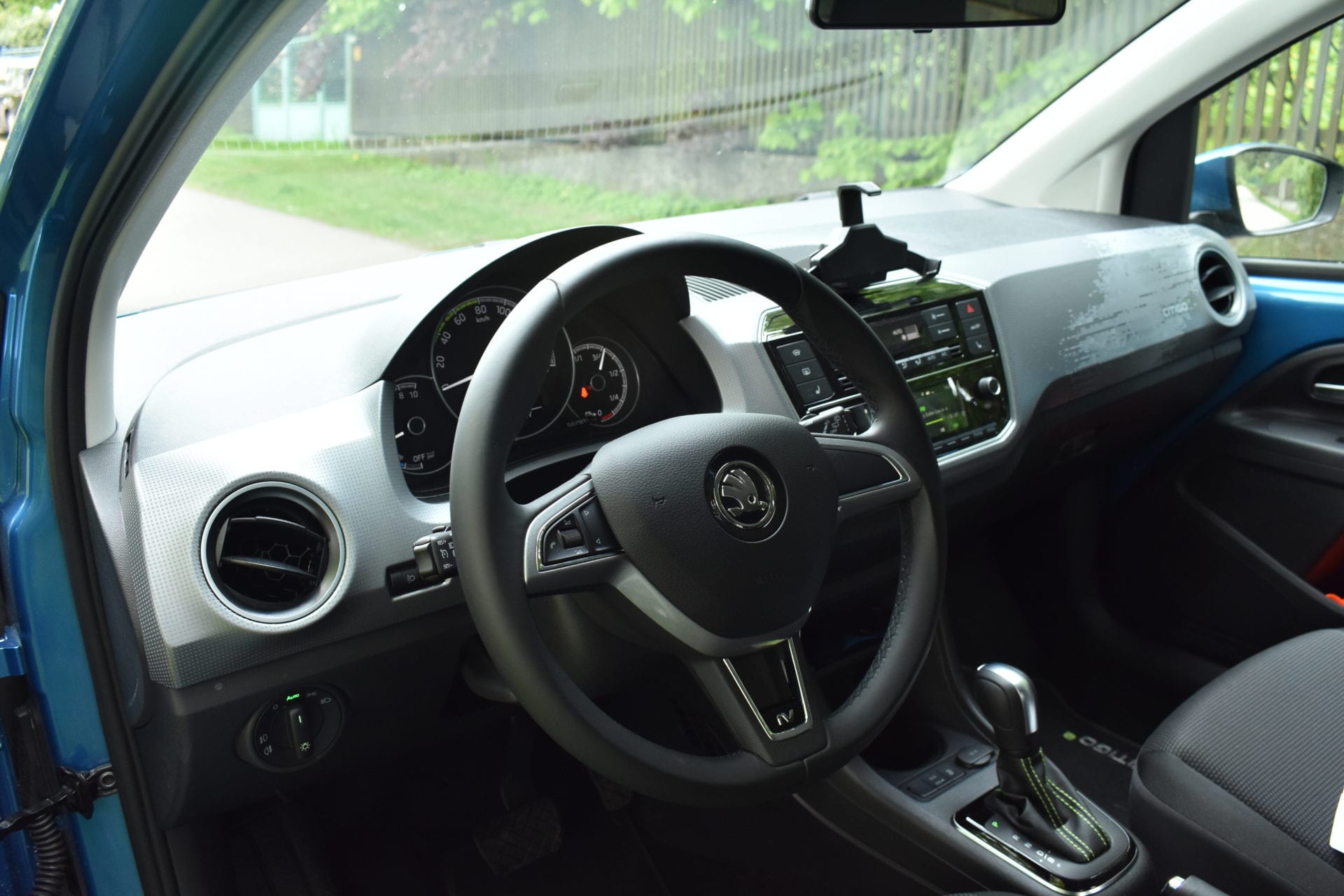 Samozřejmě převažují tvrdé plasty, ale kdo by se za ně zlobil v městském vozítku. Středová část je shodná se spalovacími verzemi, držák na telefon působí humpolácky, ale když do něj vložíte telefon, vypadá vše hned lépe. Kokpitu dominuje analogová kaplička s menším displejem. Zde se dozvíme aktuální rychlost, spotřebu, dojezd, průměrnou spotřebu, informace o nabití baterie a tak podobně. A tohle vám bude úplně stačit. Celkově má CitigoE výbavu bohatou, samozřejmě disponuje i dnes už povinným asistentem jízdy v pruzích, který bych ale radši vyměnil za sledování mrtvého úhlu nebo systém nouzového brzdění.